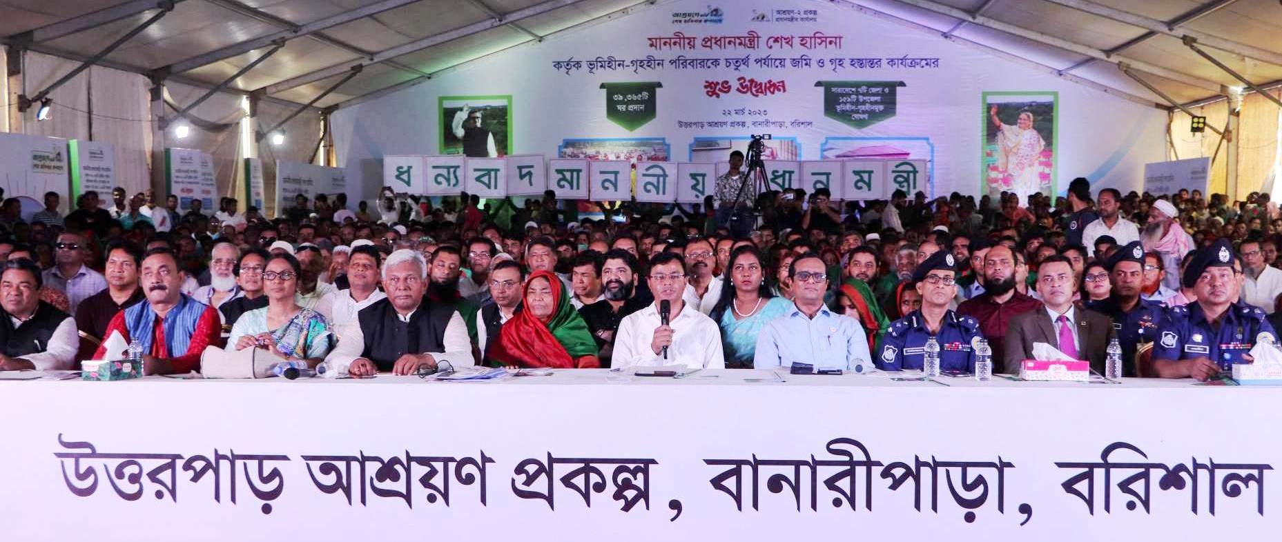 এসময় প্রধানমন্ত্রীর পক্ষে ৪র্থ পর্যায়ে ভূমিহীণ ও গৃহহীণ পরিবারকে জমি ও গৃহপ্রদান কার্যক্র উদ্বোধন শেষে বানারীপাড়া উত্তরপাড় আশ্রায়ণ প্রকল্পের ভূমিহীন-গৃহহীনদের জমিসহ গৃহ প্রদান করেন অতিথিরা। বরিশাল জেলার ৪ টি উপজেলাকে ভূমিহীন ও গৃহহীনমুক্ত ঘেষণা করা হয়েছে। উপজেলা সমূহ হলো বাকেরগঞ্জ, উজিরপুর, মুলাদী ও বাবুগঞ্জ। ৪র্থ পর্যায়ে বরিশাল জেলার ১০ টি উপজেলায় ভূমিহীন ও গৃহহীন ১৫০১টি পরিবার জন্য নির্মিতব্য গৃহ হতে কবুলিয়তসহ গৃহ উপকারভোগী পরিবারের নিকট হস্তান্তর করা হয়।