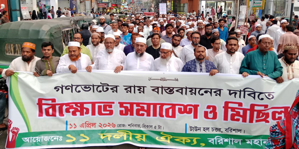 গণভোটের রায় বাস্তবায়নের দাবিতে বরিশালে ১১ দলীয় ঐক্য জোটের বিক্ষোভ