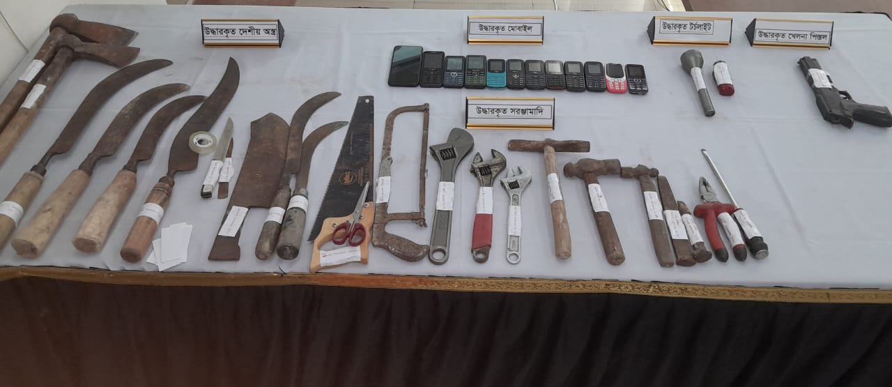 আটককৃতরা হলেন, বরিশালের বাকেরগঞ্জ এলাকায় ডাকাত দলের সর্দার ১। আব্দুল হাকিম (৪৮), পিতা- মৃত ইউসুফ জমাদ্দার, মহেশপুর, ২। মিজান চৌকিদার (৪০) ৩। মোঃ রহিম হাওলাদার (৪০) এবং জধানীর দক্ষিন কেরানীগঞ্জের ধলেশ্বরী টোল প্লাজা এলাকা থেকে ডাকাত দলের অন্যতম প্রধান সহযোগী ৪। মোঃ শাওন ইসলাম সোহাগ (২৪) ৫। মোঃ রাজা খলিফা (২৫) ৬। মোঃ নাসির হাওলাদার (৪০) ৭। মোঃ কালাম হোসেন (৩৫) ৮। মোঃ সেলিম মাতবর (৫০) কে গ্রেফতার করা হয়। এসময় তাদের কাছ থেকে উদ্ধার করা হয় ০১টি খেলনা পিস্তলসহ বিপিুল পরিমান দেশীয় অস্ত্র।