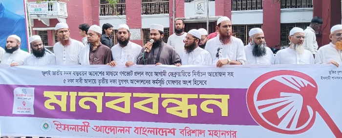নিজস্ব প্রতিবেদকঃ জুলাই জাতীয় সনদ বাস্তবায়ন আদেশের মাধ্যমে গণভোট প্রদান করে আগামী ফেব্রুয়ারিতে নির্বাচন আয়োজন সহ ৫ দফা দাবী আদায়ে বরিশালে মানববন্ধন কর্মসূচি পালন করেছে ইসলামী আন্দোলন বাংলাদেশ।