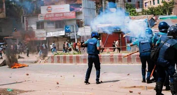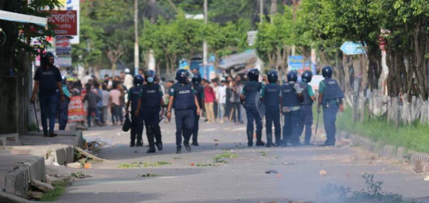 এ সময় পুলিশ তাদের লক্ষ্য করে কয়েক দফায় টিয়ারশেল, সাউন্ড গ্রেনেড, রাবার বুলেট ও টিয়ার সেল নিক্ষেপ করে। এরপর শিক্ষার্থীরা পুলিশকে লক্ষ্য করে ইটপাটকেল ছুড়তে থাকে। মূহুর্তেই রণক্ষেত্রে পরিনত হয়েছে গোটা এলাকাজুড়ে।